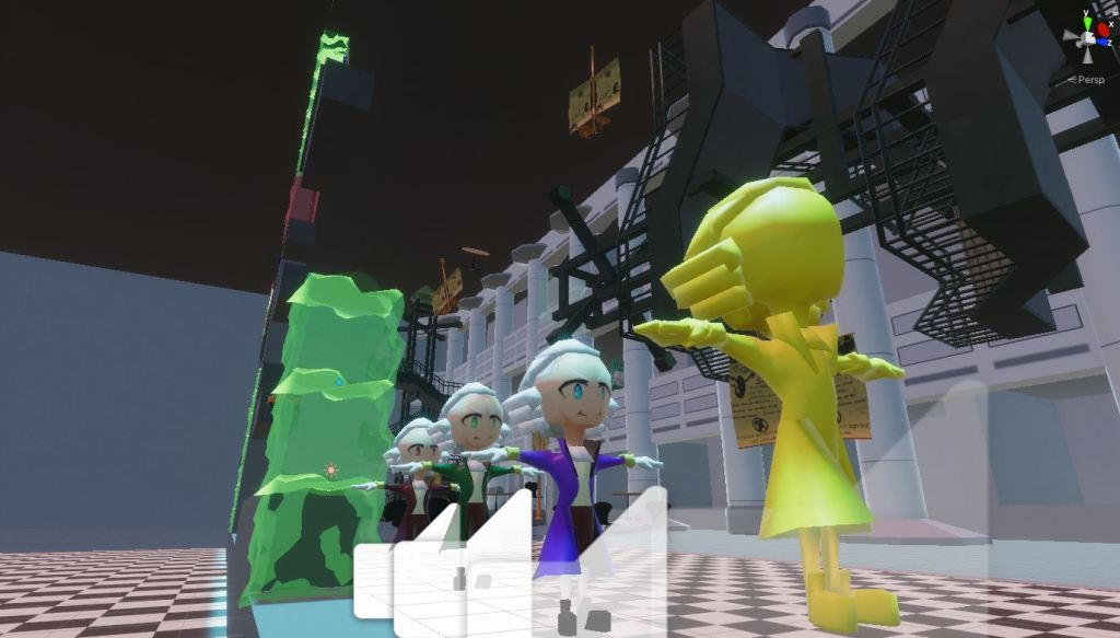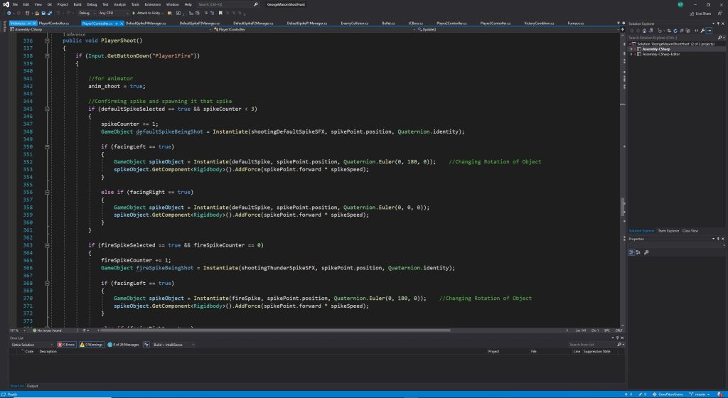Instead of splitting up into teams with classmates to create a game. This class was about working with everyone to create the game. We were split up into 4 different teams of design, art, sound, and programming to create this game. I placed myself into programming, and then was promoted to being programming lead. I handled on player mechanics, level interaction, UI Interface, and audio implementation, while tasking other programmers to create enemy mechanics and camera work with some tweaking of my code. Below are some images of our game of what I handled.